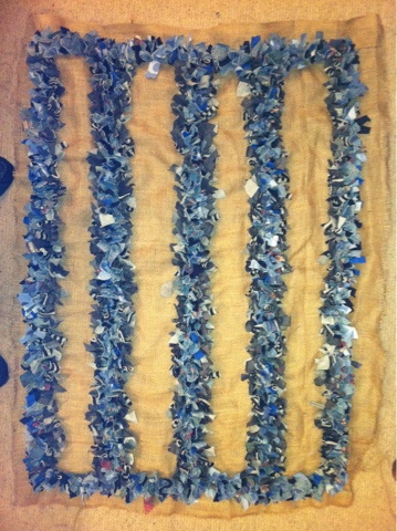 After some reflection I've decided to keep green out of Daddy's rug and stick to blues, greys and a bit of black and a hint of purple. I want a fairly sombre effect as I think that's what he'd prefer. The purple will truly only be a hint as I only have a small pair of kid's jeans and a teeshirt in purple to use, so necessity must be the mother of invention.